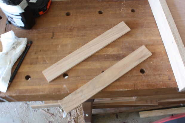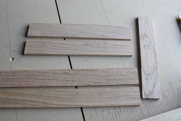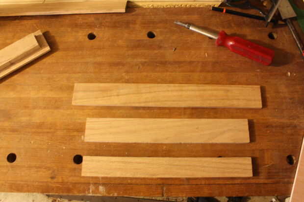 Cortar 2 tramos de 1/4 "x 2" la longitud de 8 baldosas. Acabado arena y mancha. Estas son las diapositivas.