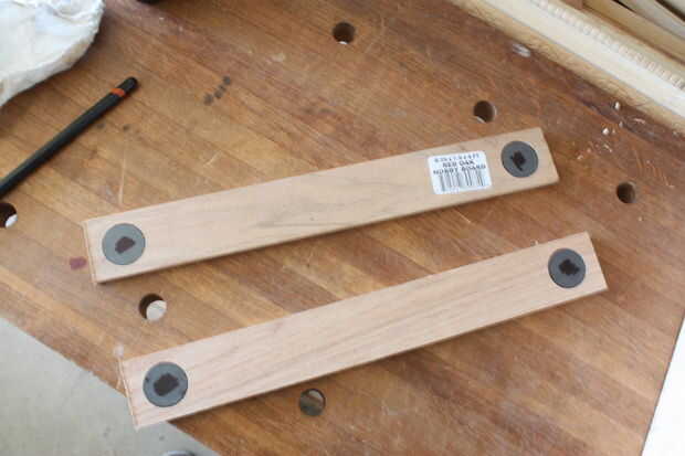 (Cierre magnético opcional) Dos líneas de marca donde el centro de las diapositivas se encuentran en la parte inferior de 1/4" de la capa fondo. Taladro 2 agujeros para 1" imanes para que queden al ras con la superficie. Asegúrese de que tener el lado atrae el imán hacia abajo. Pegarlos en.