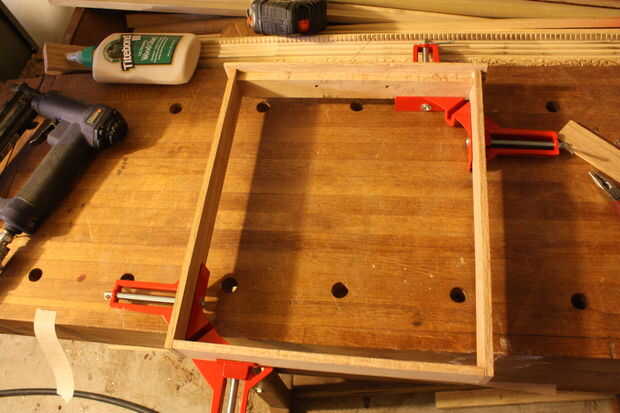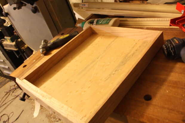 Pegamento, la clavija y sujete las piezas largas a los rebajos laterales en la cara del cajón y la pieza más corta el la parte posterior del cajón. Medir y cortar la última pieza de 1/4 capas para caber dentro de las piezas que usted acaba de poner juntos para un fondo. Acabado arena.