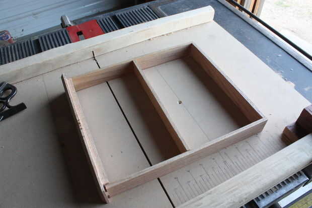 Cortar 2 tramos de 1/4 "x 2" la longitud del cajón que desea (el mío es 12 1/8") y 2 longitudes de la anchura de su cajón menos 1/2" (el mío es 9 15/16"). RIP 1/4 de una de las piezas más cortas, se trata de un divisor.