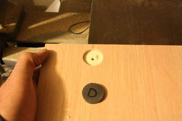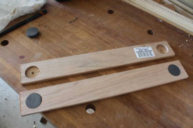 (Cierre magnético opcional) Toma un 1" forstner broca y taladro un bolsillo para los imanes para que estén al ras con la superficie de la madera. Juntar 4 imanes y marcar un lado de cada uno y poner los imanes en la misma dirección y encolar, sujetar con cinta.