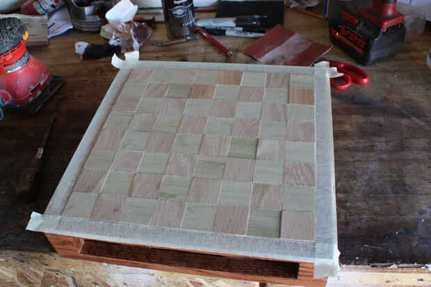 Coloque las baldosas de espacio hacia abajo en un patrón alterno. Giré el grano cada azulejo para añadir más contraste.