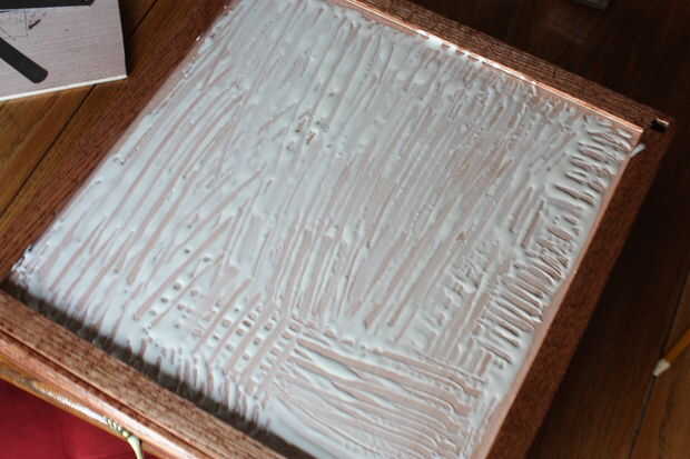 Retire la cinta adhesiva de la superficie de juego y manchar un montón de cola tratando de no en los rieles laterales.