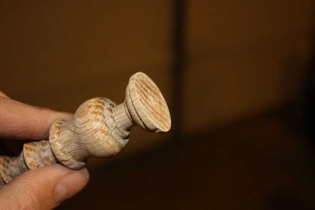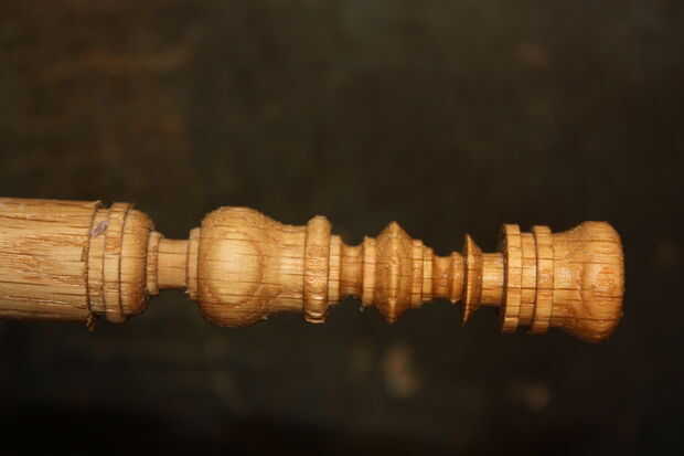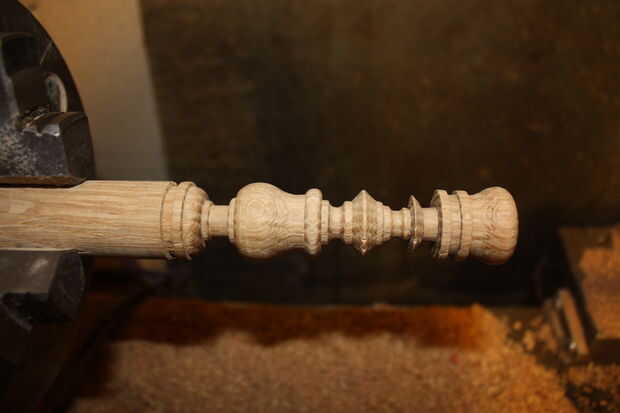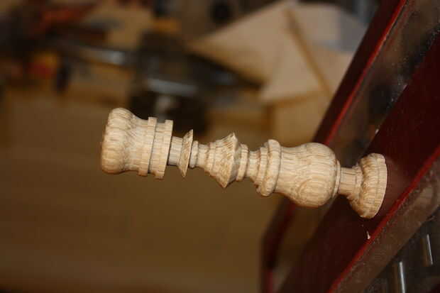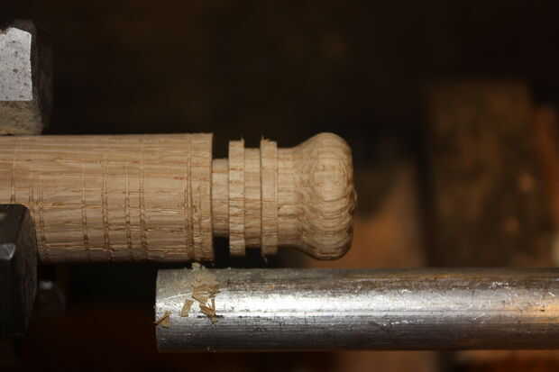 Mueva la pieza de trabajo en el mandril para reducir flexión y empiece con la cabeza de la pieza y hasta el fondo, moviendo la pieza en el mandril al llegar a la base. Utilice un cincel en forma de cerca la forma intenta cortar. Uso barato de Puerto carga de cinceles y moler lo que necesito. $8 y un trabajo extra, son grandes!