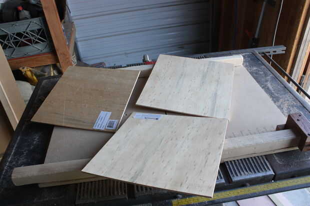Cortar 3 cuadrados de 1/4 capas el ancho 8 azulejos más 1/2". Uno será la parte superior para montar los azulejos, uno abajo y uno serán reducidos más adelante a ser el fondo del cajón.