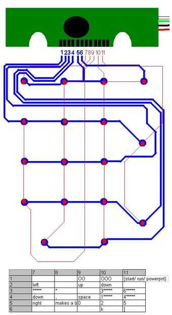 Si nos fijamos en las hojas de contacto de plástico desde el teclado, puedes ver que consta de dos capas de ponerse en contacto con. Cuando las conexiones debe tener un lado del cable de su prueba en un contacto de una capa, mientras que sondear contactos de la otra capa de hoja de contactos. En la mía pernos de 1-6 fueron en una sola hoja, mientras que pines 7-12 fueron por el otro. Esto hizo mi método de prueba algo como lo siguiente: