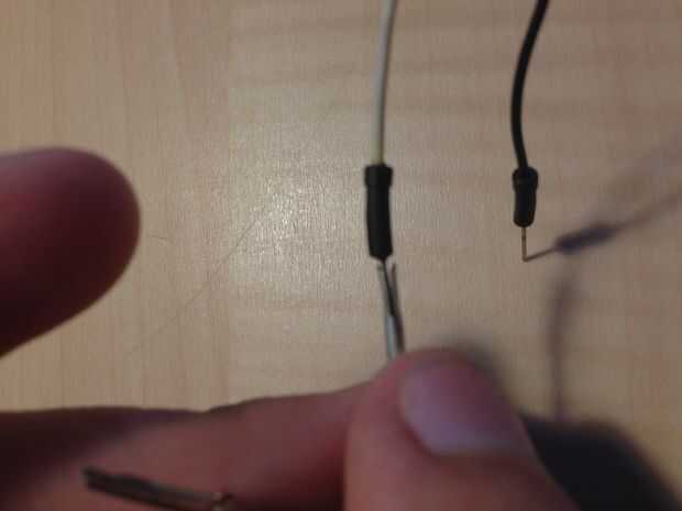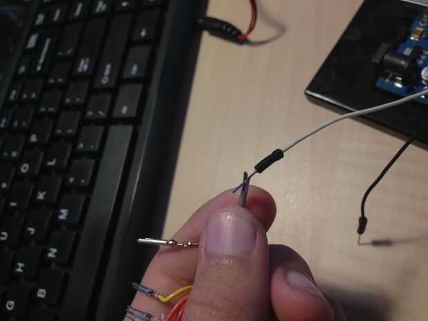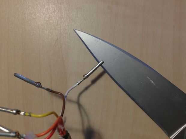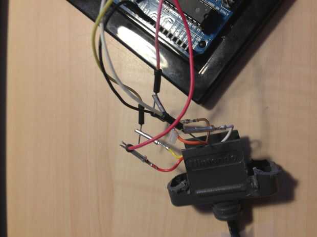 La primera cinta el cable del controlador a la mesa por el arduino. Si lo dejas pasar, tienes un tiempo difícil hacer buenas conexiones. Mi jumper cables derecho de deslizamiento de las pequeñas cosas de metal, así que tomó un cuchillo de bolsillo y apalancar los extremos apartes (ver fotos) por lo que pude meter la perpendicular del cable jumper en lo toma. Al conectar los 5 cables hasta el controlador, asegúrese de que no se toquen entre si, y que son coincidentes los colores correctamente.