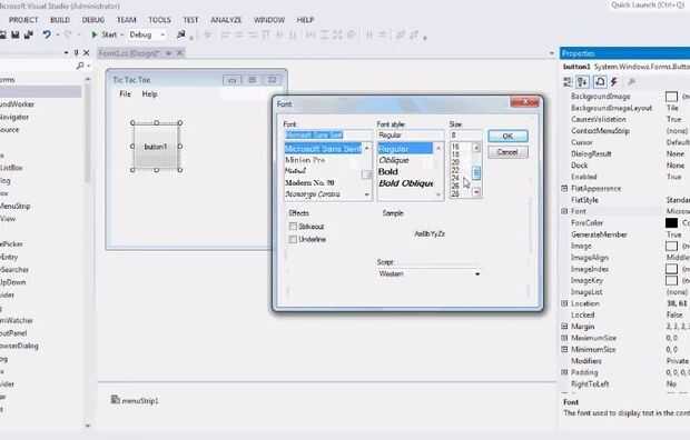 2. tras ajustar completamente el espacio de trabajo. Haga clic en cualquiera de los button(tool). Y en cuadro de diálogo de 'Propiedad' ajustar la fuente, gran suficientes tales que 'X' y ' o ' s será claramente visible. Asegúrese de que cada botón tiene la misma fuente.