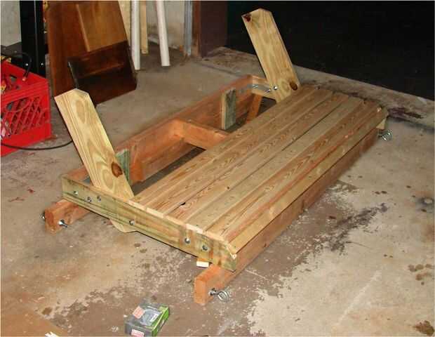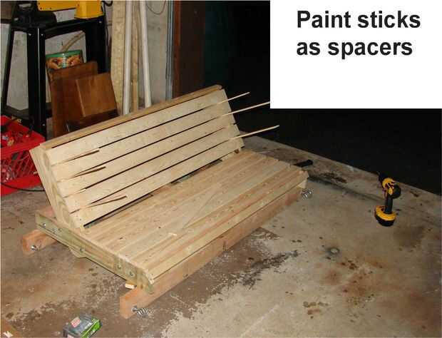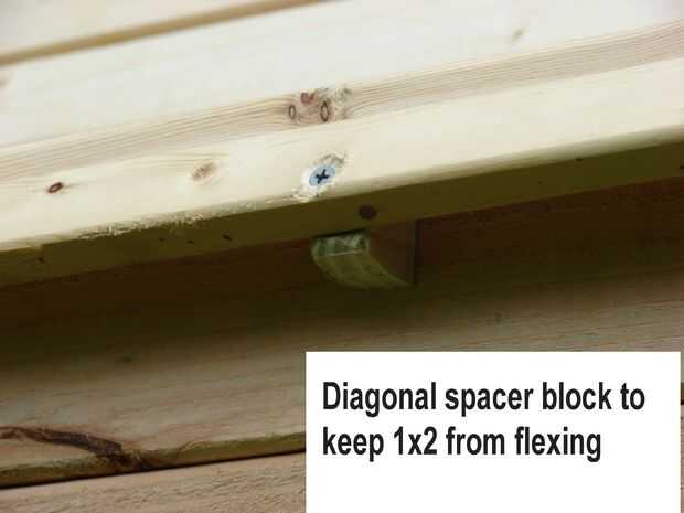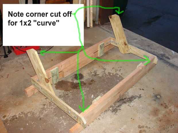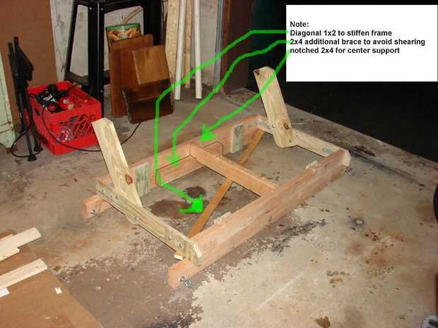 La parte inusual es el poner de las 2 de 2 x 4 para hacer un 2 x 8. la parte inferior 2 x 4 siendo el soporte para el Banco entero. Utilizar las piezas de chatarra de 1 x 4 y 2 x 4 para conectar a la parte inferior del marco del Banco. Nota el desecho de 2 x 4 se levanta sobre una 1/2" para que no resbale el cuadro del Banco de los soportes. Esto creó la necesidad de la ayuda del centro de la muesca. La imagen justo antes de que el encofrado se inicia muestra esto mejor.