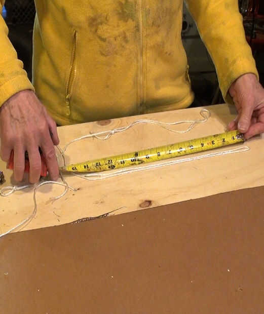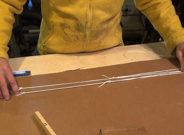 -Corte dos 46" pedazos de hilo--usar un encendedor para quemar a través de la cuerda para evitar colapso. Tenga cuidado con los dedos y el fuego.