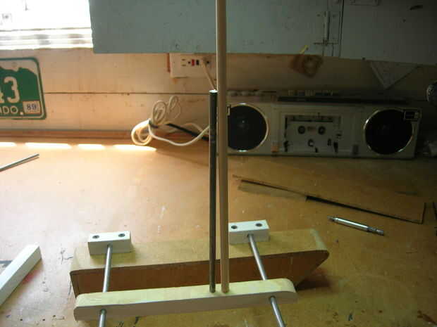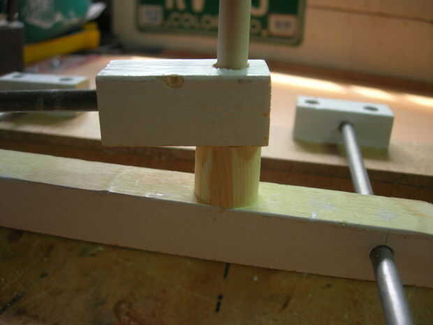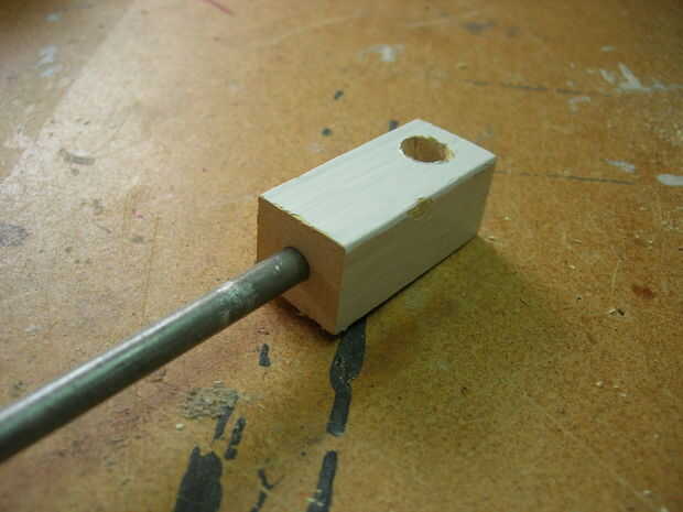1 1/2 pulgadas pedazo de madera cuadrada para fijar el brazo al mástil. Luego perfore un agujero para la pluma entrar (ver foto #3). Taladre un agujero para el mástil entrar en perpendicular al orificio para la pluma (cuadro #4). Agrande el orificio por mover la pieza mientras la broca en el agujero. El agujero del mástil debe ser suficientemente grande para que la pieza a deslizarse fácilmente y moverse libremente en el mástil. El auge del palillo en el agujero correcto y coloque el conjunto a un lado por un tiempo.