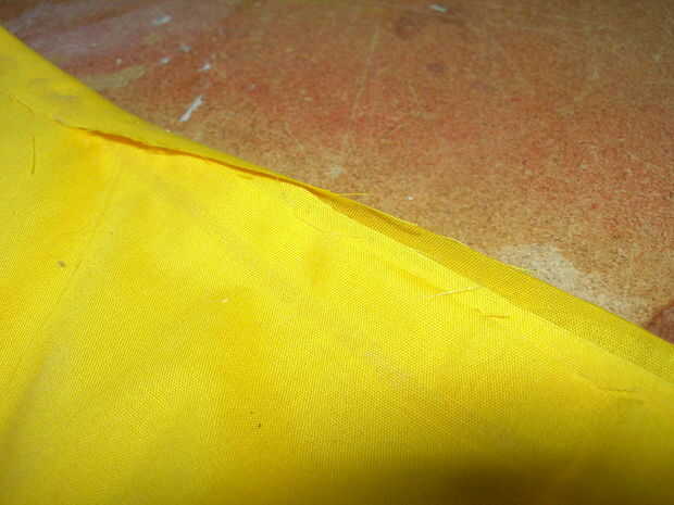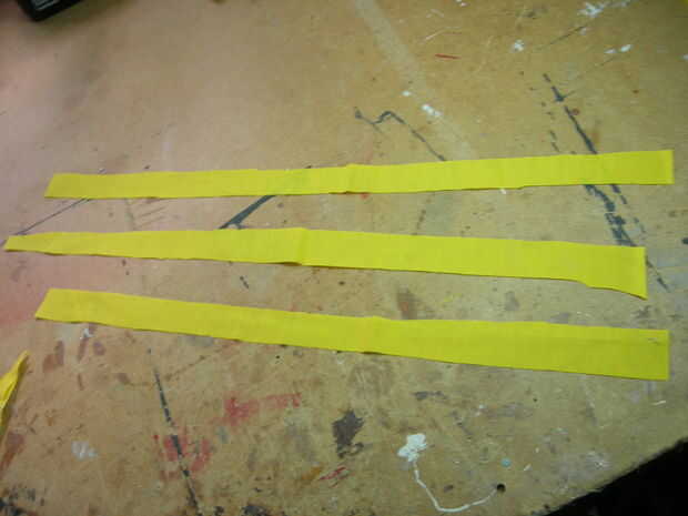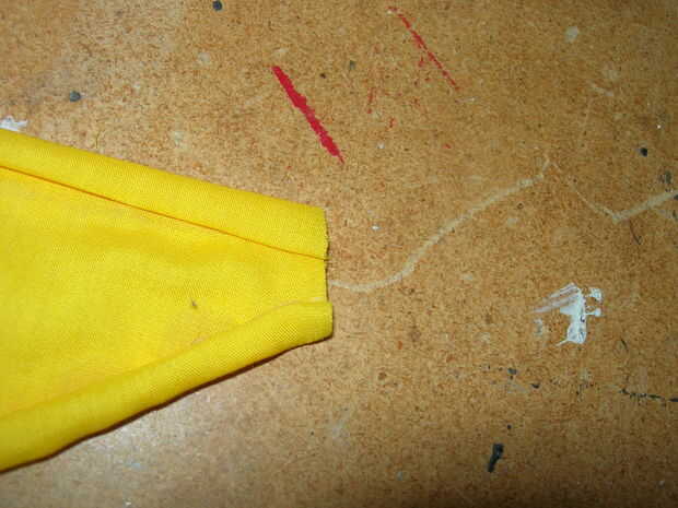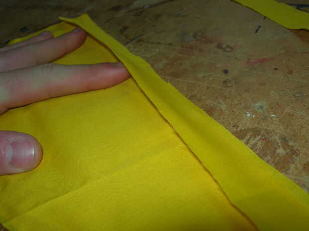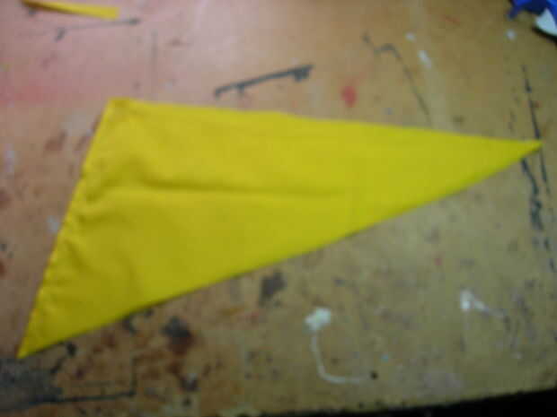 Cortar su paño en un rectángulo de 18 x 9. Luego corte el rectángulo diagonalmente para hacer dos triángulos iguales. Corte bastantes tiras de 1 pulgada para ir todo el camino alrededor del perímetro de la vela. Pegar un triángulo encima de la otra, aplica pegamento alrededor del borde. En un lado del triángulo, pegue una tira en un borde para que la tela cuelgue sobre el borde pero quede con ella. Hacer esto a todos los 3 lados. Ahora la franja alrededor del borde del enrollamiento y péguelo en el otro lado. Final de los tres lados. Asegúrese de que creó un tubo, que necesita para el montaje. Recortar todas las esquinas para dejar al descubierto las aberturas de los tubos. La vela terminada es el cuadro final.