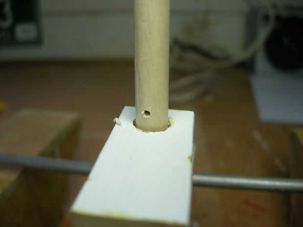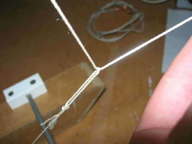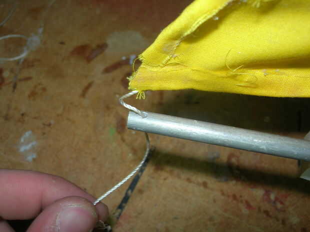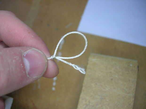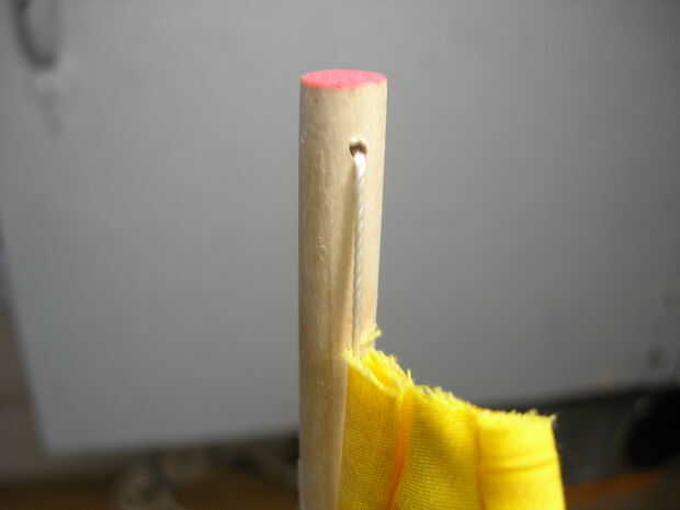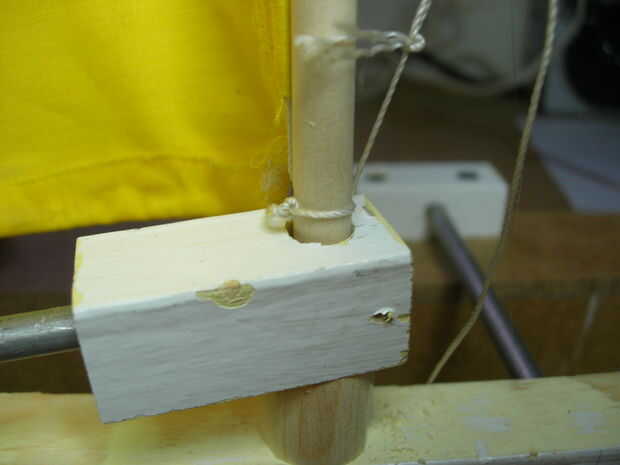 después de que sea a través del orificio. Pegar el extremo superior de la cuerda del mástil en el lazo inferior, tire para apretar. Un nudo cuando la cuerda está apretada.