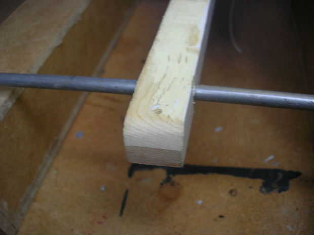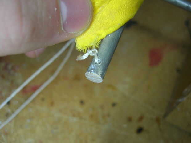 La cadena pasada a adjuntar es controlar cuánto la pluma gira. En el bloque de madera que el mástil se une a, perfore un agujero en el mismo lugar que el agujero en el cuadro #1. Insertar una cadena a través del orificio en el extremo de la pluma y a través del orificio nuevo (2 agujeros perforados porque el primer agujero no era lo suficientemente grande). Ata la cuerda en el orificio del boom no saldrá. La otra cadena puede utilizarse para controlar el auge (si lo desea, puede adjuntar a un servo y crear un barco RC, todo lo que necesitas es un timón). Termina el montaje.