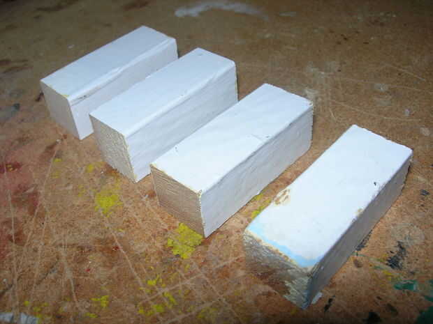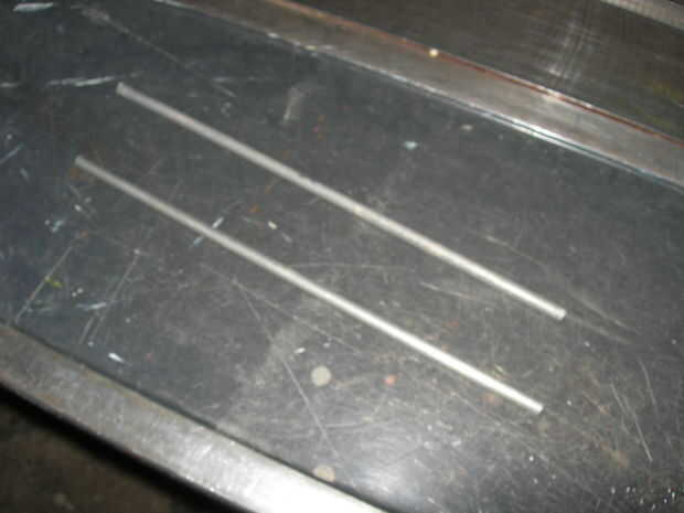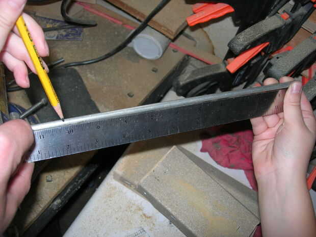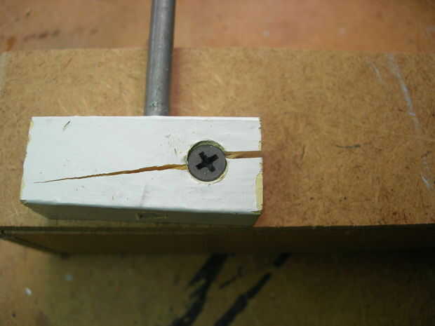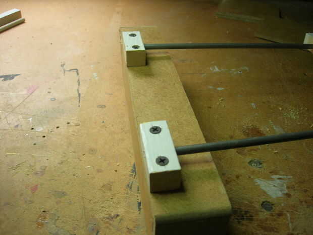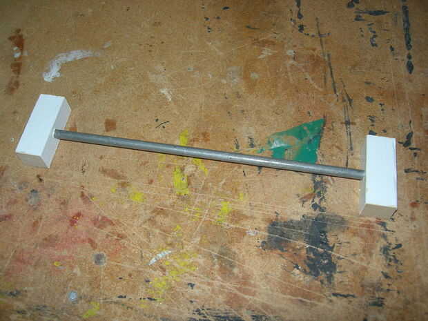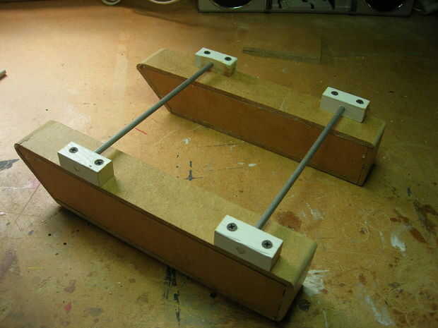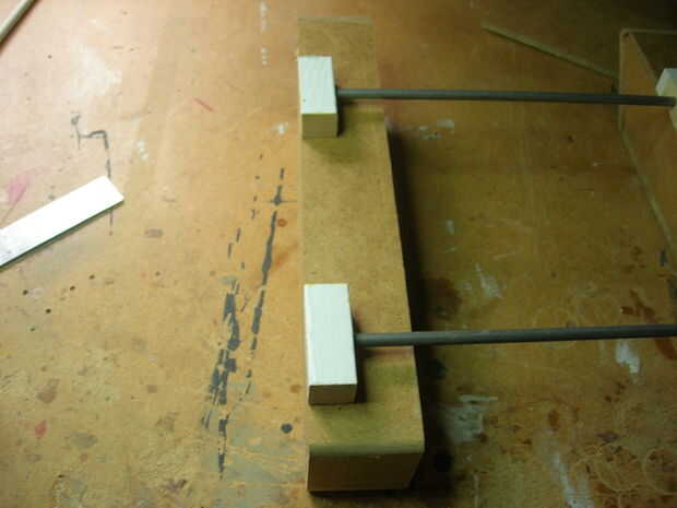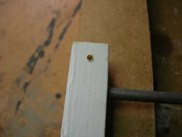 Cortar la varilla (metal o madera) en trozos de dos 10 pulgadas. Luego corte el material cuadrado madera en trozos de 4 2 pulgadas (corté dos extras en caso de que se separan). Luego perfore un agujero en el centro de cada una de las piezas de 2 pulgadas. El agujero debe ser del mismo tamaño de diámetro que las barras que sólo se cortan. Pulse un pedazo de madera en cada extremo de una varilla (Foto #5). Coloque el ensamblaje de varilla y madera en el casco izquierdo para que queden al ras con el borde izquierdo. Una varilla debe ser cerca de la parte trasera y el otro debe ser 2/3 del camino hacia el frente. Perfore orificios piloto en ambos lados de la varilla y tornillos. Repita con la otra varilla. Asegúrese de que la madera no divide. Simplemente repita el proceso con el casco adecuado. Asegúrese de que el conjunto de varilla y madera quede al ras con el lado derecho del casco adecuado.
