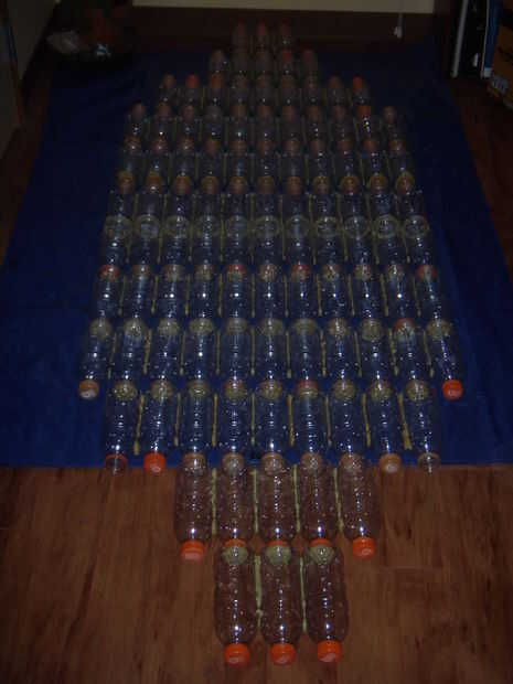 ésos abierto kayaks que se puede comprar en tiendas de artículos de deporte. Vamos a hacer unas capas planas, como balsa y apilarlos uno encima del otro. Comience pegando botellas de lado a lado en secciones ordenadas. Al trabajar con pegamentos, es recomendable tener buena ventilación. El pegamento que usé no dio un aroma muy fuerte, pero siempre es una buena idea estar a salvo. Una línea de adhesivo de 3/16"– 1/4" de ancho es suficiente. Necesita un total de 12 secciones horizontales por la cubierta del barco. Los tamaños de las secciones son: