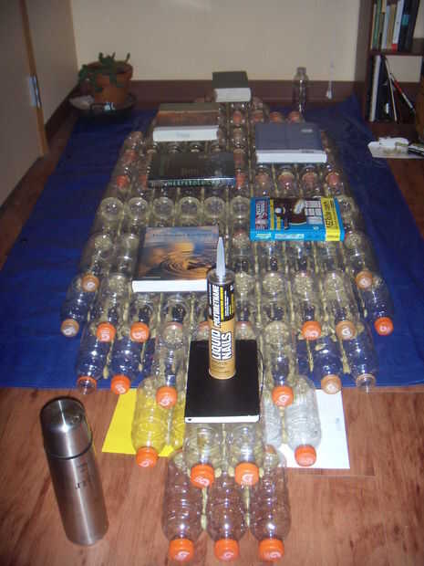 en la parte superior. Estas botellas se deben pegar en la "V" poco profunda entre cada botella de la capa base. Además, cada sección de la segunda capa debe compensarse, por lo que toca 2 secciones de la capa base, como se muestra en la imagen. Esta segunda capa actúa como la parte inferior del barco y le da una forma áspera de "casco".