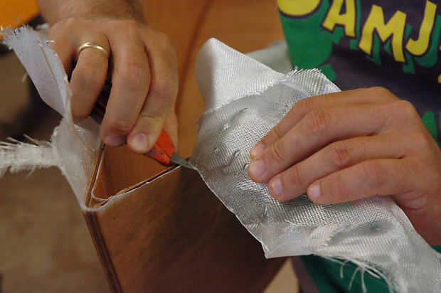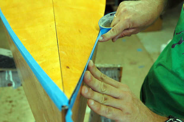 Pase una tira de cinta adhesiva sobre la parte exterior de la costura pura. Esto evitará que el epoxi funcionamiento hacia fuera cuando hacemos el interior. Para hacer cualquier goteo a través tan suave como sea posible, necesitas la cinta sea lisa, sin arrugas. La mejor manera de hacerlo es pegar hacia abajo de la cinta en un lado de la costura como dispensar, y luego volver y pliegan la costura más adelante.