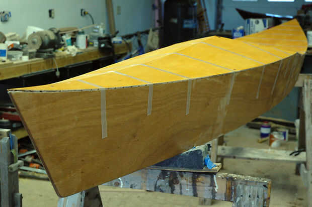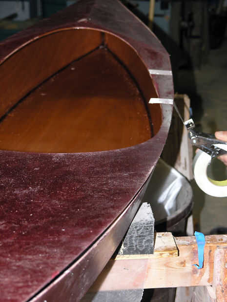 La cubierta se adapta encima de los lados del casco. Comienzan alineando cada extremo y grabar libremente abajo con cinta de embalaje reforzada de fibra. Luego, a partir de cerca de la cabina, cinta de la cubierta apretada hacia abajo el borde superior de los lados del casco.