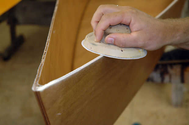 Utilizar papel de lija de grano 80 para limpiar los bordes agudos de vidrio. El vidrio de la arena al ras de la madera contrachapada. No desea cambiar la forma de la madera, desea eliminar cualquier goteo desordenado y dejan un borde limpio y suave. Limpiar los bordes de la cubierta mientras estás en él.