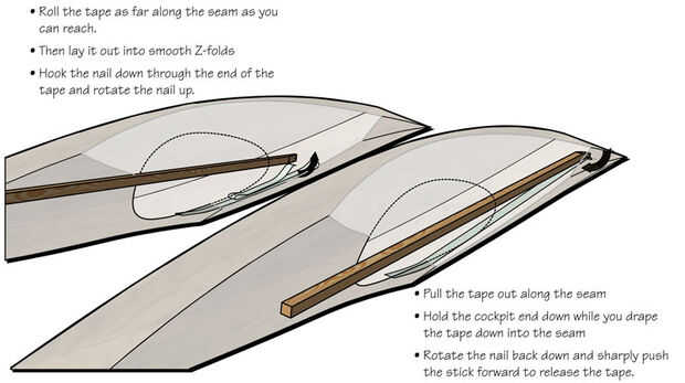 Coloque la cinta hacia abajo en el interior de la costura más baja; a partir de 6" detrás del nudillo y estirar la tela hacia la proa. Centro de la cinta en la costura con la mitad en el casco; la mitad en la cubierta. Cuando usted baje lo la costura como usted puede conseguir; Tire hacia atrás un poco así que usted puede desenrollar en un aseado Z-Fold sobre costura.