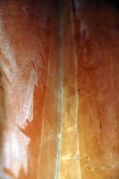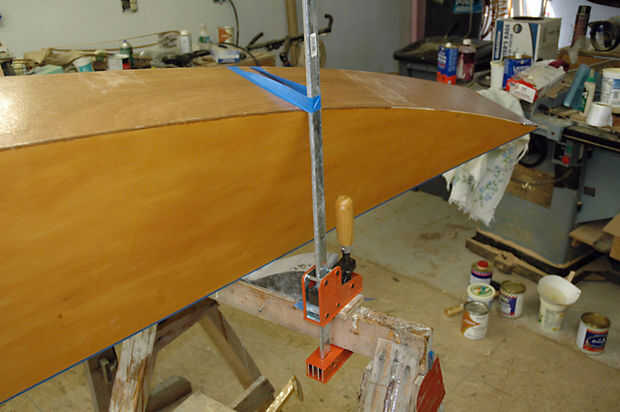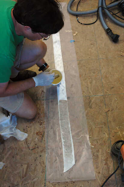 Medir una longitud de cinta de fibra de vidrio previamente tejida desde el nudillo en la pura línea junto a la cabina hasta la proa del barco. Poner una longitud de papel encerado en el suelo o el Banco de trabajo. Moje la longitud de la cinta con epoxi. Mientras que usted tiene el pincel en la mano, humedezca previamente la costura más baja dentro del barco en su lado. Puede utilizar su cepillo en un palo para obtener epoxy en la costura hasta el final.
