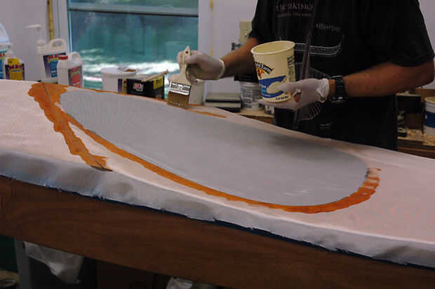 Después de hacer el área alrededor de la cabina siga mojando el resto de la cubierta de la misma manera lo hizo el casco. Asegúrese de que el vidrio está mojado hacia fuera en la cinta de enmascarar. Cepillo de alguna resina adicional a la línea central de la cubierta delantera para ayudar a llenar la brecha entre los paneles.