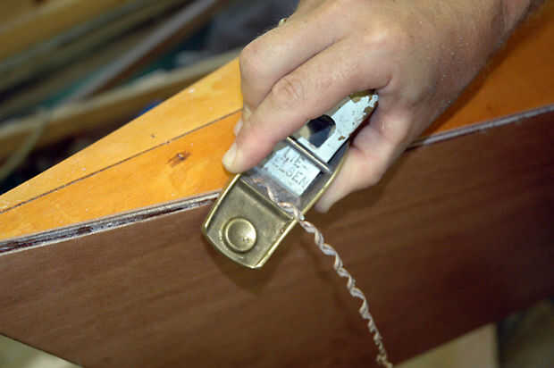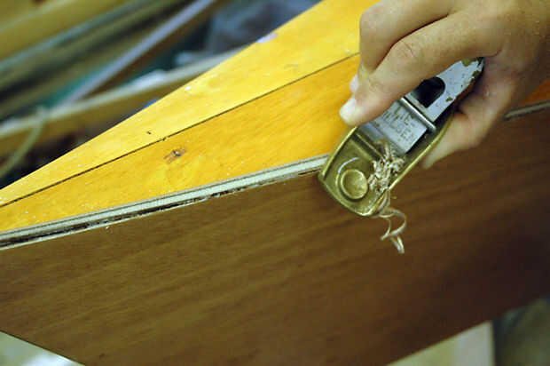 Comience con un chaflán, golpear las esquinas del chaflán y suavizar la más redonda. Lije el borde para alisar hacia fuera y dar toda la cubierta de un ligero lijado con grano 120. Lije el borde superior del casco con grano 80 para ayudar a que el epóxico se adhieren.