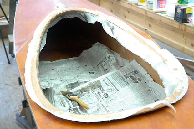 Comience pintando algunos epoxy a la brazola, luego coloque cuidadosamente el paño de corte diagonal en el borde vertical de la brazola presionando justo en el epoxi húmedo.