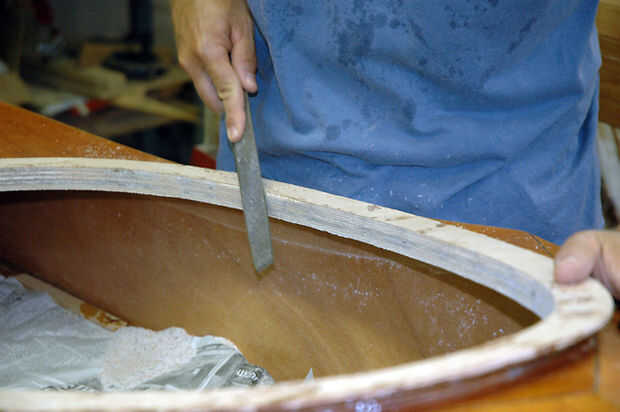 Cuando el pegamento ha sido limpiado apagado es tiempo para redondear sobre el borde. Otra vez, empezar por hacer un chaflán de 3/8" de ancho. Un escofina de media caña funciona bien aquí. Después del chaflán, desprender las esquinas luego redondo encima. Lo mismo para el borde interior inferior y superior de la brazola. Si tienes poco un más redondo y un router se puede utilizar en el borde superior, pero todavía tendrá que hacer a mano el borde inferior.