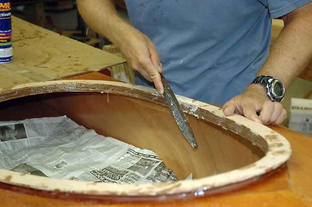 A continuación, utilice su cepillo de chip para dab el paño en el suelo. No movimiento de la tela, sin embargo, que se distorsione. Simplemente presione la tela con la punta del pincel. Agregue epoxy para saturar la tela. Asegúrese de que empape el paño debajo de la cubierta también. Deje el borde superior de la tela sobre el borde del labio de la brazola de la caída. No trate de envolver bajo el labio.