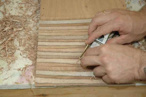 Guíese por la cuesta de los pasos de escalera, plano abajo de las escaleras. Cortar cada paso uniforme, tratando de mantener la cantidad de material que han rebanado apagado cada capa uniforme y consistente. El objetivo es hacer un liso, plano, desde la parte superior de la cuña en la parte inferior. Si es que la zona cepillada en una capa es más ancha que las otras capas, ajustar su cepillado para hacerlas otra vez. Como el plano más profundo en la madera contrachapada, que usted comenzará a ver rayas oscuras y luego la madera puede cambiar de color un poco. Las líneas oscuras son las capas de pegamento entre las capas de la madera contrachapada. Utilizar estas líneas de pegamento como guías para ayudar a asegurar una superficie plana recta. Trabajo para mantener las líneas de cola rectas y paralelas. Si ves la parte de la línea curva hasta más alto que en cualquier lado, plano por los lados para que aparezca el resto de la línea recta y aún.