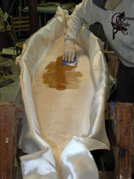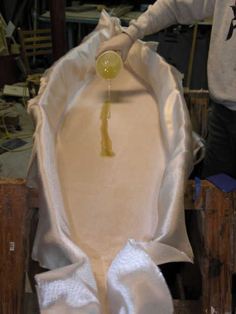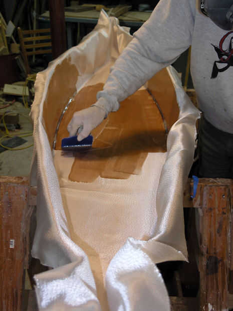 Desea mantener el epoxi contiguos. No ponga un charco aquí y otra allí, tratar de avanzar en un frente sólido desde el centro de la embarcación hacia los extremos. No te preocupes si hay zonas húmedas gris parcialmente, pero hacer trampa grandes áreas de tela blanca suelta entre áreas de trapo claro saturado.