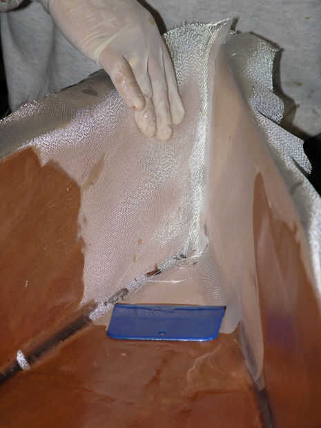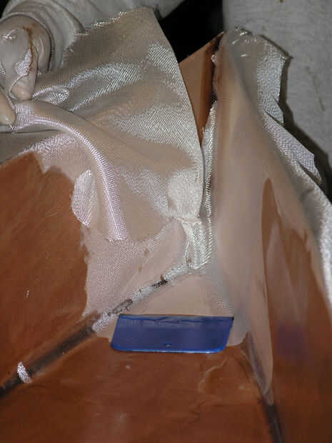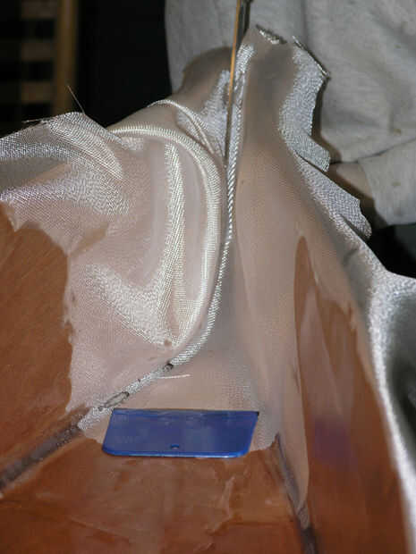 Ahora para los puentes de tela en la máquina. Éstos aparecieron como que había sacado epoxy hacia los lados. Como hiciste esto levantó a un poco tela con la resina. Como resultado no hay suficiente tejido en el barco para llenar en el filete.
