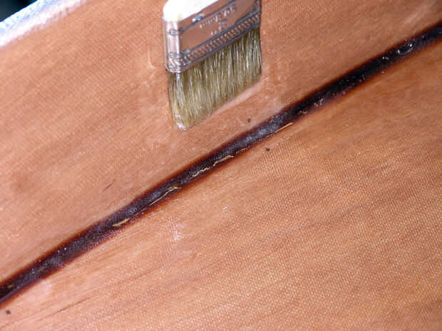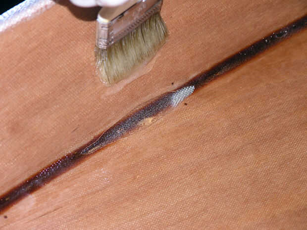 Con un pincel un poco seco Coloque justo sobre el filete y apuntando hacia abajo, pulse suavemente la tela hacia el filete. Que debe deslizarse fácilmente, pero a veces se se ve atrapado en el borde superior rugoso de la madera contrachapada. Puede que necesite levantar un poco la tela en la parte superior del borde para que no se atoren.