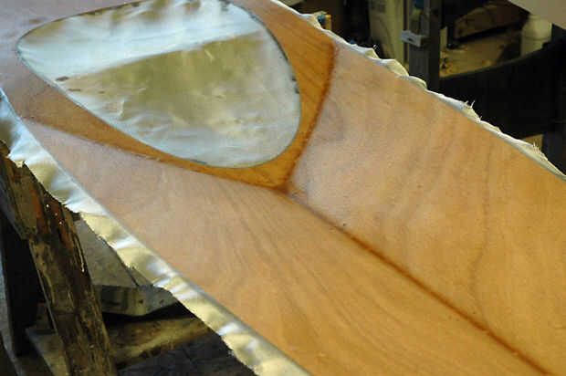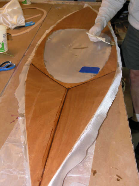 Si se puede acceder a ella el mismo día, esperar un par de horas después de aplicar la resina. En este punto el epóxico debe ser parcialmente curada, pero todavía suave. Ahora es el mejor momento para dar a la tela una capa extra de resina para sellar los agujeros de perno. Utilice un rodillo de espuma para aplicar una fina capa de epoxy mezclado sobre la superficie del conjunto interior de la la cubierta y el casco.