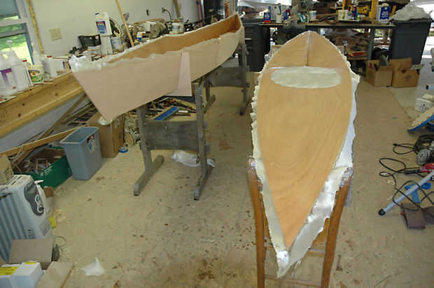 Recorte el exceso de fibra de vidrio con un cuchillo. Mantenga el borde de la cuchilla firmemente contra la madera y mantenga la fibra de vidrio. Cortar el vidrio movimientos incluso liso. No necesita vio en el cristal, sostenga la cuchilla firmemente contra la madera y deslice hacia abajo la longitud del barco.