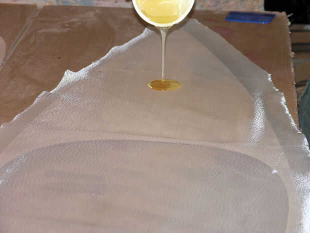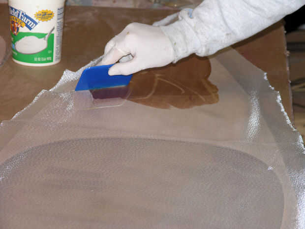 Cuando termines haciendo las capas de la mojado-hacia fuera de la fibra de vidrio debe terminar con un acabado mate con la textura de la tela muy evidente. No debe haber manchas brillantes. Si usted necesita eliminar cualquier exceso utilizar la escobilla de goma para raspar el exceso.
