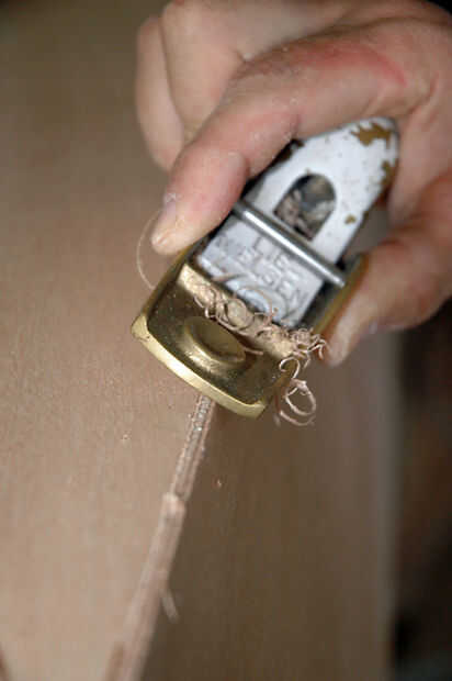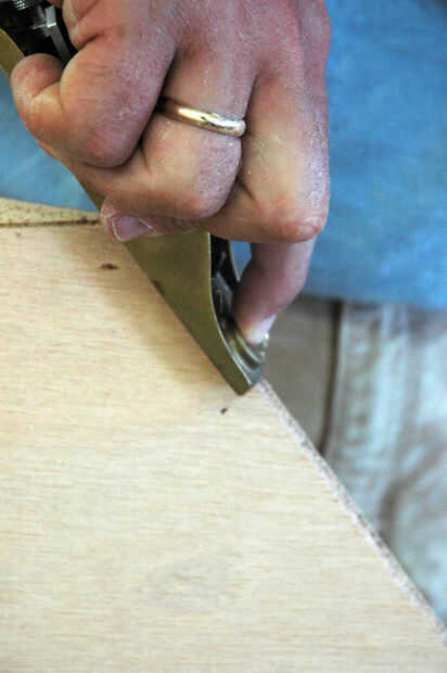 Mantenga este mismo ángulo hasta que el borde superior del chaflán se corta todo el camino de regreso hasta el borde del panel inferior de casco. No corte en el panel inferior. Ángulo siguiente el avión golpear las esquinas de cada lado del chaflán. Esto significa unos golpes fuertes del avión sobre el borde superior del chaflán, cortar la parte inferior del panel un poco y luego de unos golpes a lo largo del borde inferior.