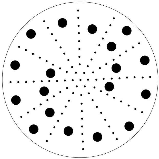 1. acoplador discos - los orificios normales se arreglan en dos espirales logarítmicas. Los más pequeños están en números alternos distribuidos entre 12 radios del disco. Diámetro del disco es 22 cm