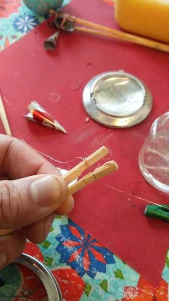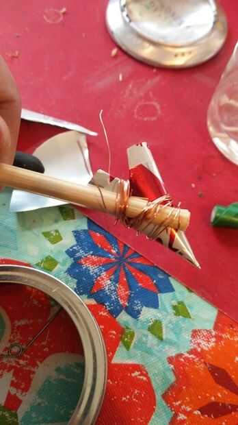 3. Envuelva un extremo alrededor de uno de los palillos de dividir la mitad, dejando un tramo corto al final.
