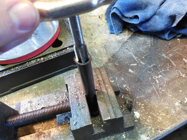 #4 1/2" perforación del paso anterior se alinearán el grifo perfectamente estrecho en el orificio de 15/32". Utilizar un grifo 13 1/2 x en un lado de la tubería de unos hilos y el otro alrededor de una pulgada. Este paso no es necesario ser exactos.