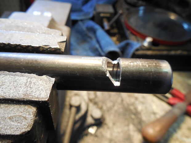 6 # 1" desde el extremo con hilos de corte 1" profundo corte una ranura a 90 y 45 grados. Limpiar y quitar las rebabas con limas manuales. Deje los bordes afilados en el interior de la ranura.