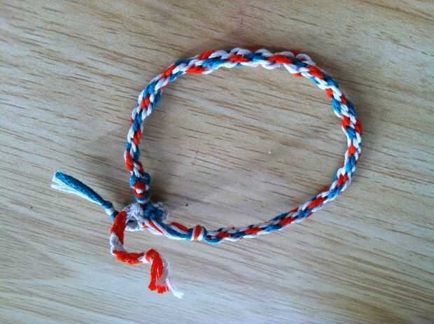 Cadena ese perrito para arriba. Hay un montón de direcciones de kumihimo y patrones en el Internet, pero de sherrycayheyhey maravilloso ' ible será que empieces con lo básico (e incluso tiene un video!). Seguí sus instrucciones para trenzado (con ocho hebras en lugar de dieciséis): abajo, izquierda arriba, girar a la derecha hacia la izquierda. Mi primera pulsera fue un desastre porque no mantener un ojo en mi tensión de filamento, pero mi segundo tomó tal vez veinte minutos y yo no podía estar más feliz con él.