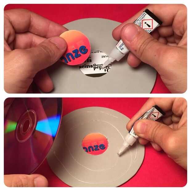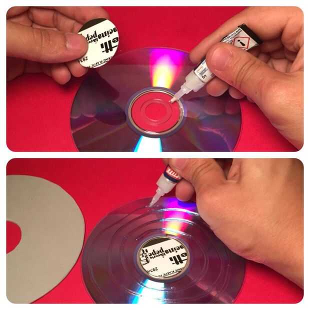 Comenzar pegando el círculo de plástico en el centro de un CD. Luego aplicar pegamento más en el CD y pulse en el círculo de espuma. Pega otro círculo pequeño en el centro y finalmente el pegamento en el otro CD.