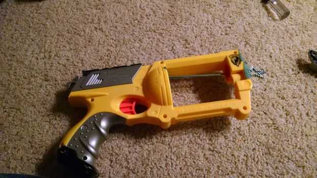 Surgió esto en 10 minutos. me tardé. 15 - 30 minutos de ensayo y error con esto. ADVERTENCIA: este arma es muy confiable y dudoso. he conseguido ir una yarda más o menos y otra caer directamente de la barrica.