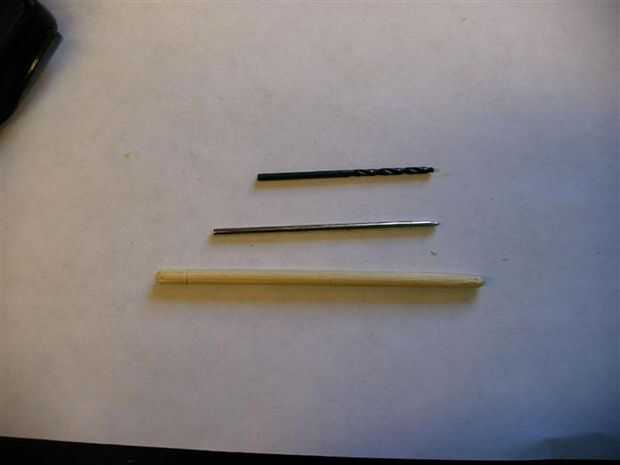 Línea de la broca, pluma y lápiz, para determinar hasta qué punto el taladro puede perforar un agujero abajo el bambú. Usted no quiere ir demasiado cerca del final, donde se pone más fina. Utilizar la longitud de la broca para mostrar donde usted puede cortar la aguja.