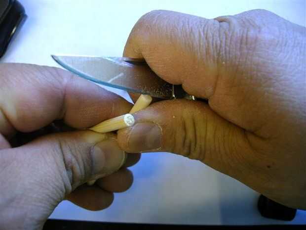 Anotar la aguja y romperla. Lisa y cuadrada de los extremos cortados con el cuchillo.