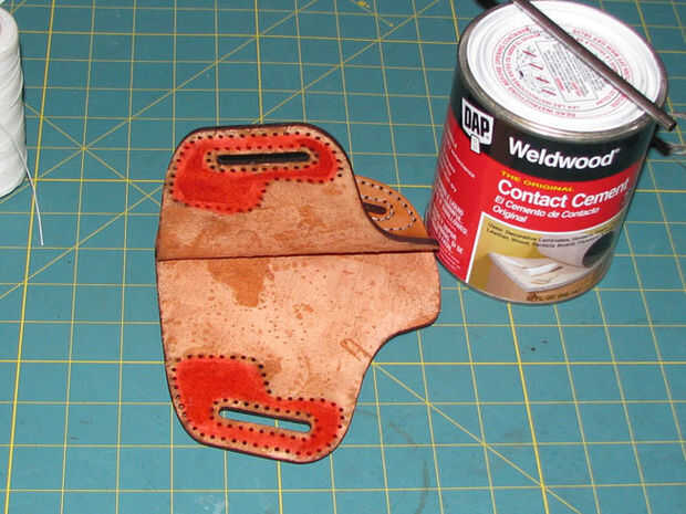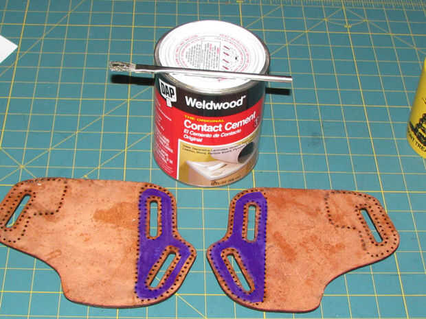 Comenzaremos por pegar el borde de ataque. Coloque el lado liso del cuero hacia abajo en su área de trabajo. Aplique una pequeña cantidad de cemento de contacto a cada mitad de la funda de protección en las áreas indicada en azul. Cemento un poco y extender con un pincel, teniendo cuidado de no para conseguir fuera de las áreas indicadas, es importante no tener cemento entre los agujeros de costuras y el borde de la pieza. Permita que el cemento seque hasta que esté apenas pegajosa, después junte firmemente los dos lados.
