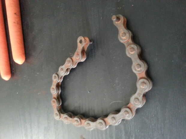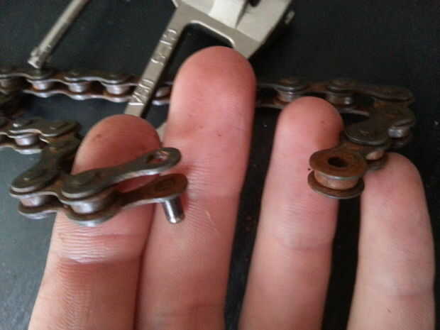 Utilizando el interruptor de cadena, o uno prestado si es barato como yo, romper la vieja cadena de piezas-bin y crear una cadena de enlace 20 o así. Asegúrese de dejar las patillas en la placa externa de los enlaces del final. Esto hará que armar nuevamente la cadena más fácil.